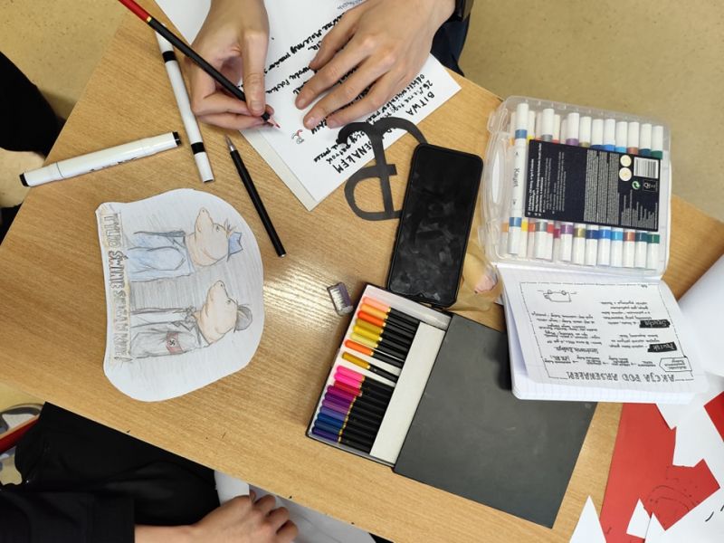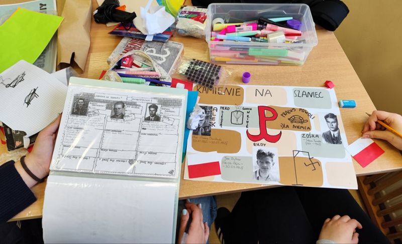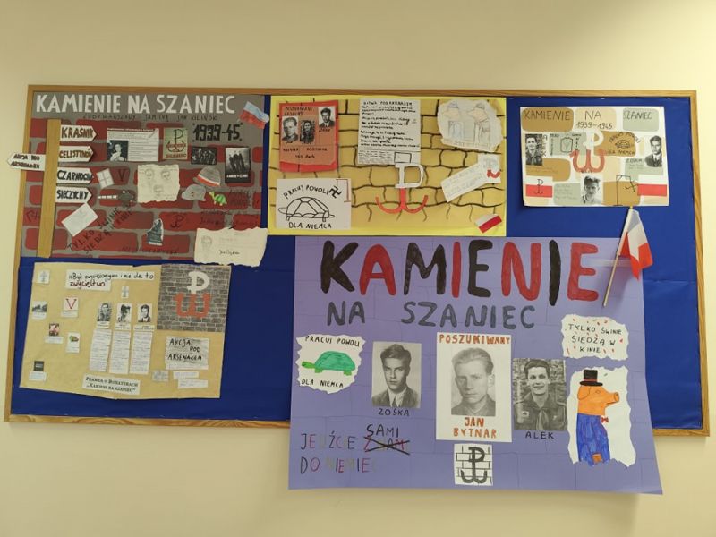 Uczniowie klasy 8b utrwalili znajomość „Kamieni na szaniec”, tworząc własne murale inspirowane losami Rudego, Alka i Zośki.