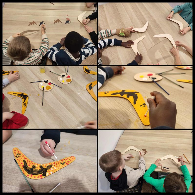 W części warsztatowej odkryli tajemniczy świat aborygeńskich symboli, którymi dawniej przekazywano informacje. Każdy uczeń wykonał własny bumerang – ozdobiony wzorami inspirowanymi sztuką Aborygenów.