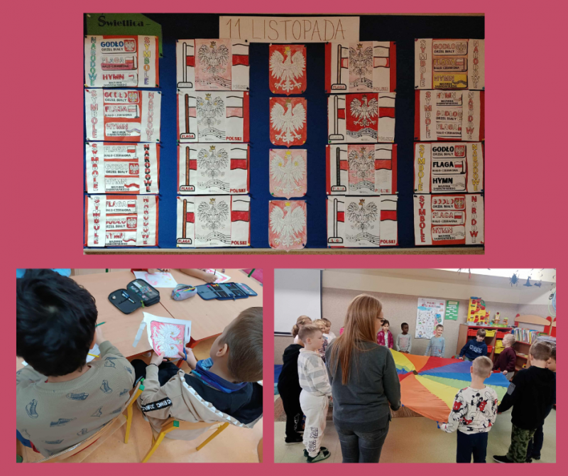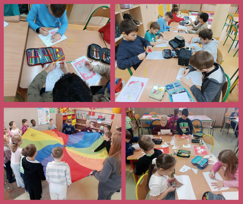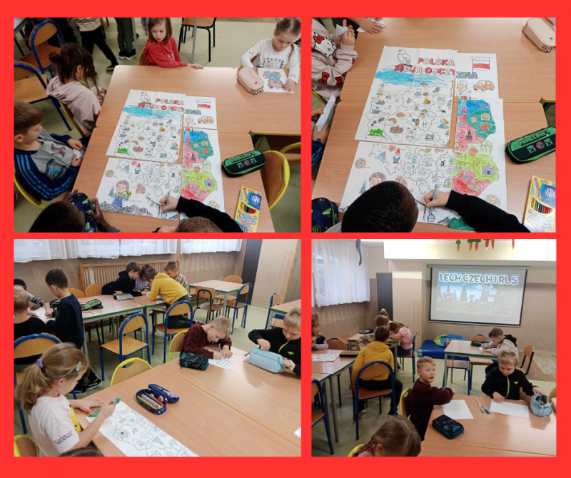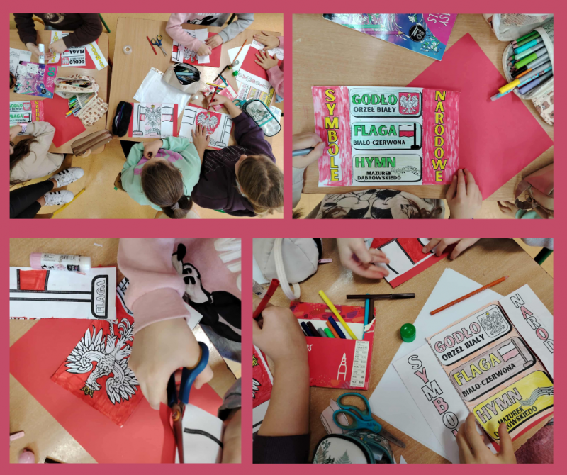 W dalszej części zajęć uczniowie rozmawiali o symbolach narodowych – fladze, godle i hymnie – oraz o tym, jak należy je szanować. W części plastycznej dzieci wykonały biało-czerwone kotyliony oraz rysunki przedstawiające flagę Polski i inne symbole narodowe. Prace zostały wyeksponowane na szkolnym korytarzu, tworząc patriotyczną gazetkę. Nie zabrakło również wspólnego śpiewania piosenek patriotycznych, takich jak „Jestem Polką i Polakiem” oraz zabaw ruchowych związanych z tematyką narodową. Na zakończenie dzieci dzieliły się swoimi przemyśleniami na temat tego, czym dla nich jest Polska i dlaczego warto być dumnym ze swojego kraju. Zajęcia przebiegły w miłej i podniosłej atmosferze, a uczniowie wykazali się dużym zaangażowaniem i zainteresowaniem tematem.