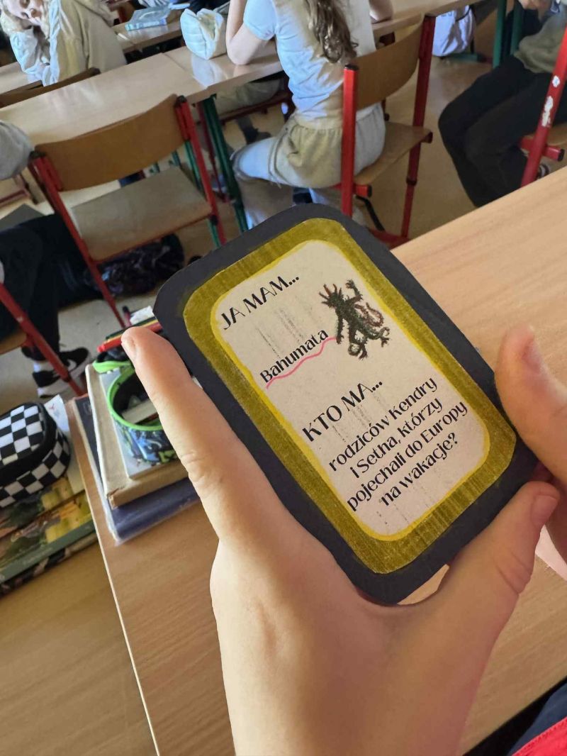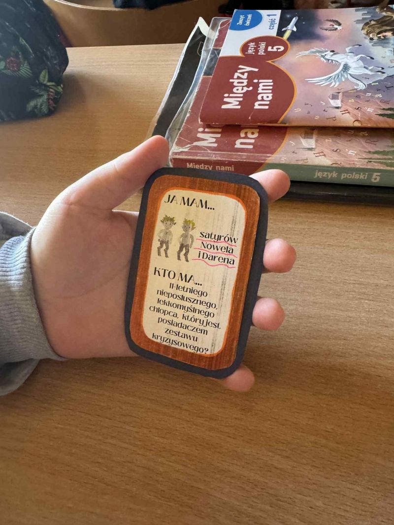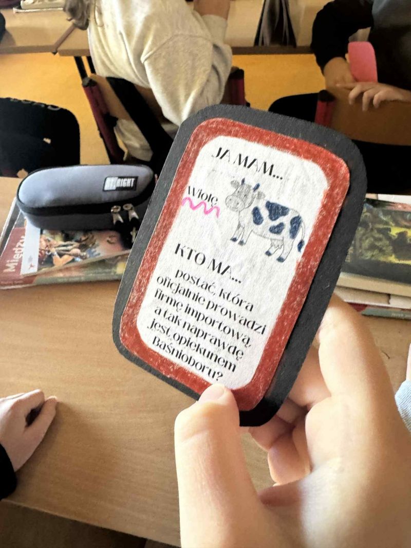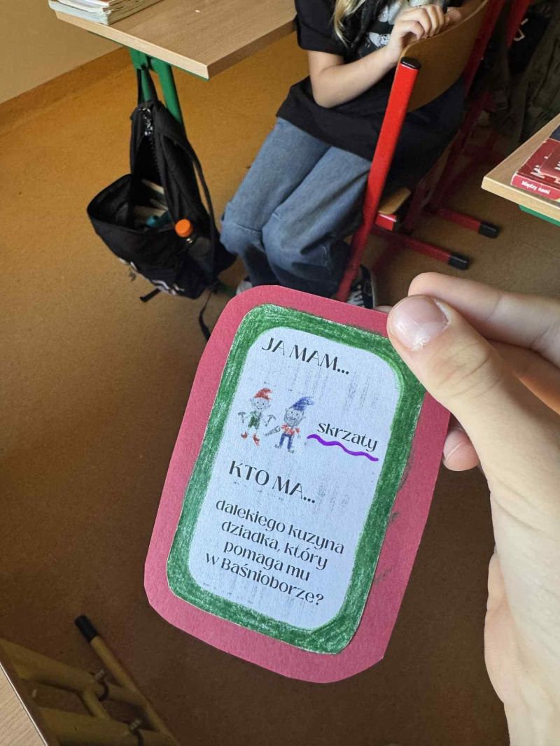 Podczas omawiania lektury „Baśniobór” Brandona Mulla uczniowie klasy 5d wzięli udział w ciekawej grze „Ja mam, kto ma…”, dzięki której utrwalili wiedzę o bohaterach książki.