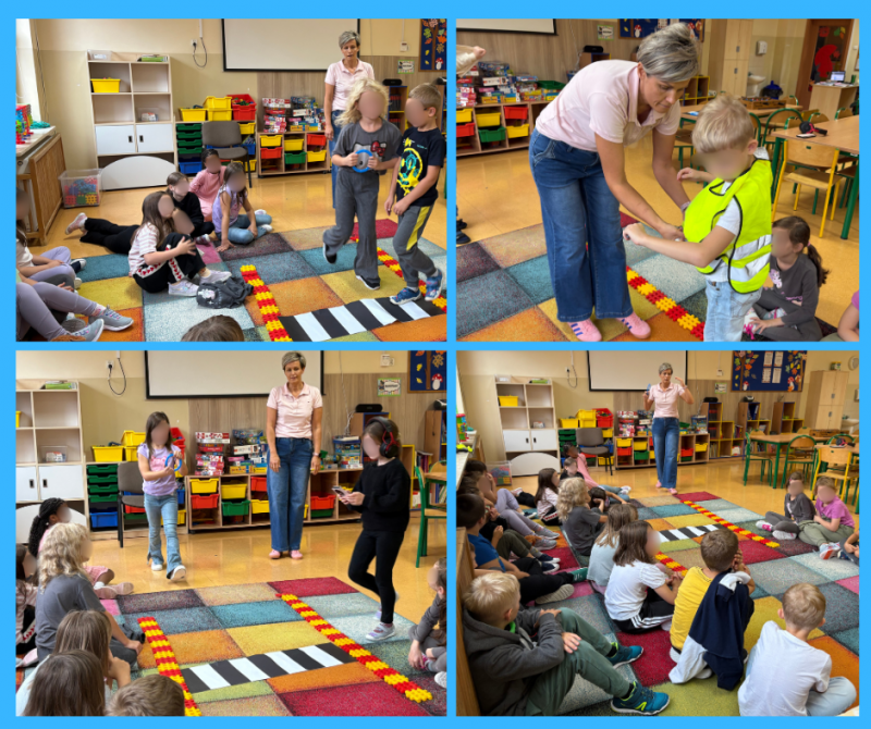 Dzieci wcielały się w role pieszych i kierowców, odgrywając scenki sytuacyjne, które pozwalały ćwiczyć prawidłowe reakcje. W ramach quizu sprawdzano znajomość zasad ruchu drogowego, a zabawy ruchowe – takie jak „zielone – idź, czerwone – stój” – pomagały utrwalić podstawowe reguły bezpiecznego poruszania się.