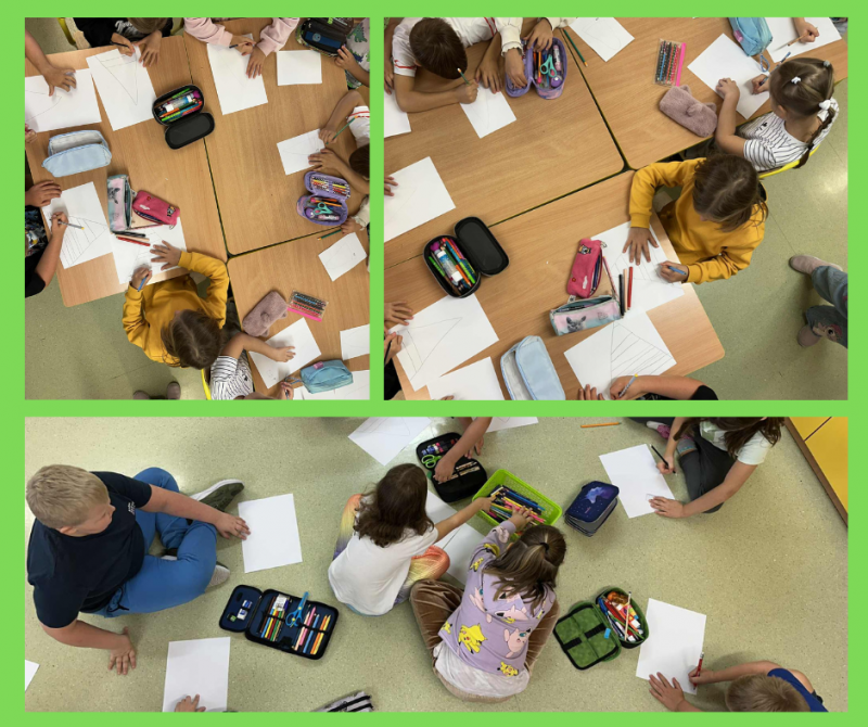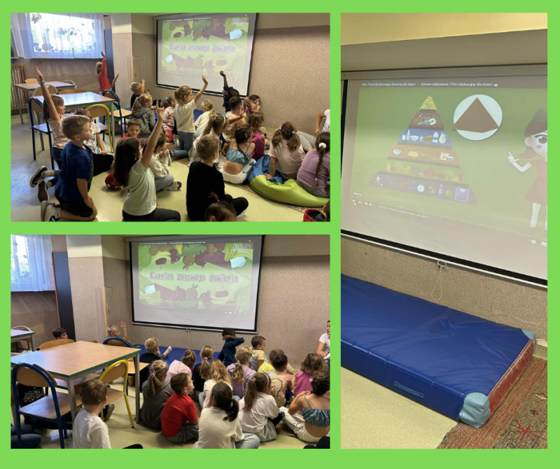 Podczas zajęć świetlicowych dzieci zapoznały się z zasadami zdrowego odżywiania. Rozmawiały o tym, jakie produkty są korzystne dla zdrowia, a których należy unikać. Poznały piramidę żywieniową oraz dowiedziały się, jak ważne są warzywa, owoce, produkty pełnoziarniste i odpowiednie nawodnienie. W części plastycznej dzieci wykonały własne piramidy żywienia, wykorzystując kolorowy papier, ilustracje produktów spożywczych oraz klej. Dzięki temu utrwaliły wiedzę o grupach produktów i ich roli w codziennej diecie. Zajęcia zakończyły się quizem, który pomógł sprawdzić i utrwalić zdobyte informacje.