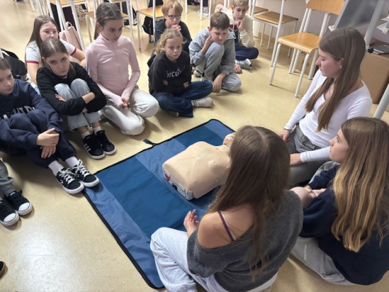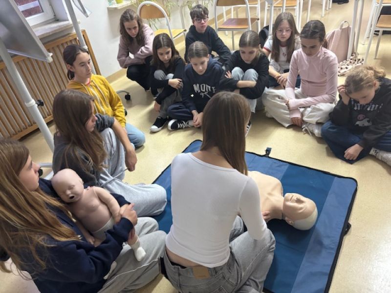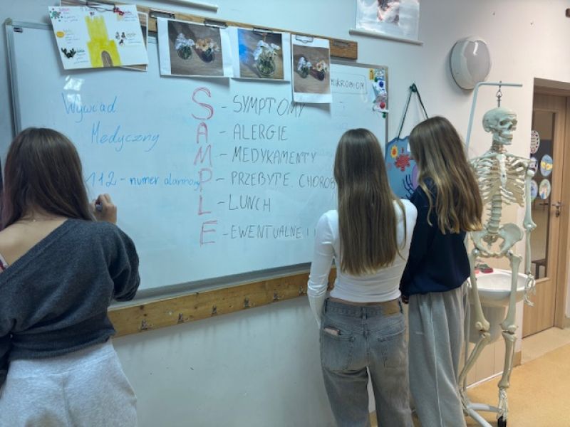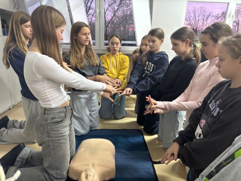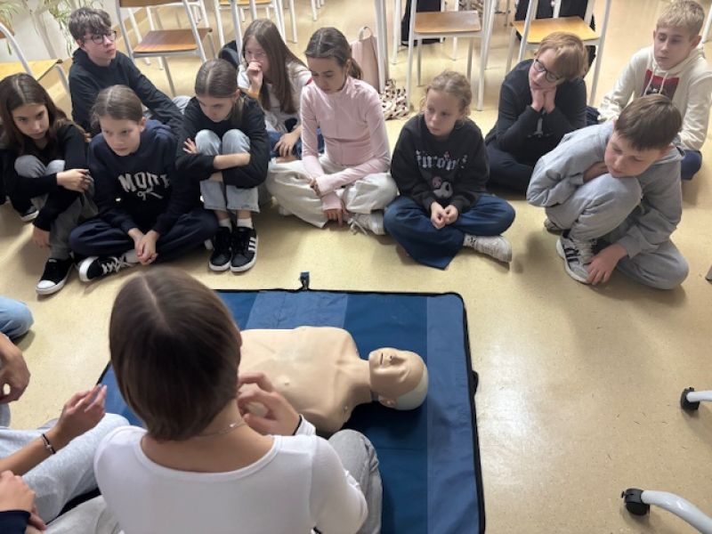 Ósmoklasistki, chodzące na koło naukowe ,,Nauka skarb drogi”, prezentowały młodszym biologom, resustytucję. Uczennice zadbały o szczegóły i ćwiczenia, podkreślając wagę ,,złotej” i udzielania pierwszej pomocy.