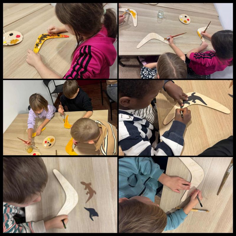 W części warsztatowej odkryli tajemniczy świat aborygeńskich symboli, którymi dawniej przekazywano informacje. Każdy uczeń wykonał własny bumerang – ozdobiony wzorami inspirowanymi sztuką Aborygenów.
