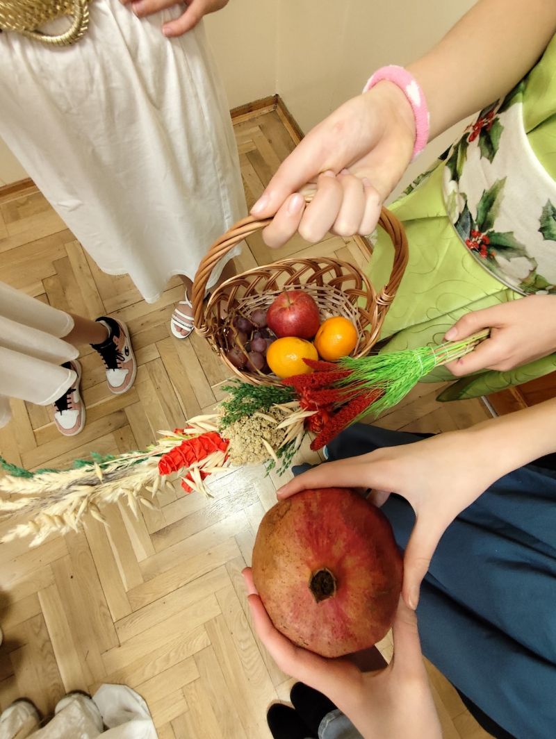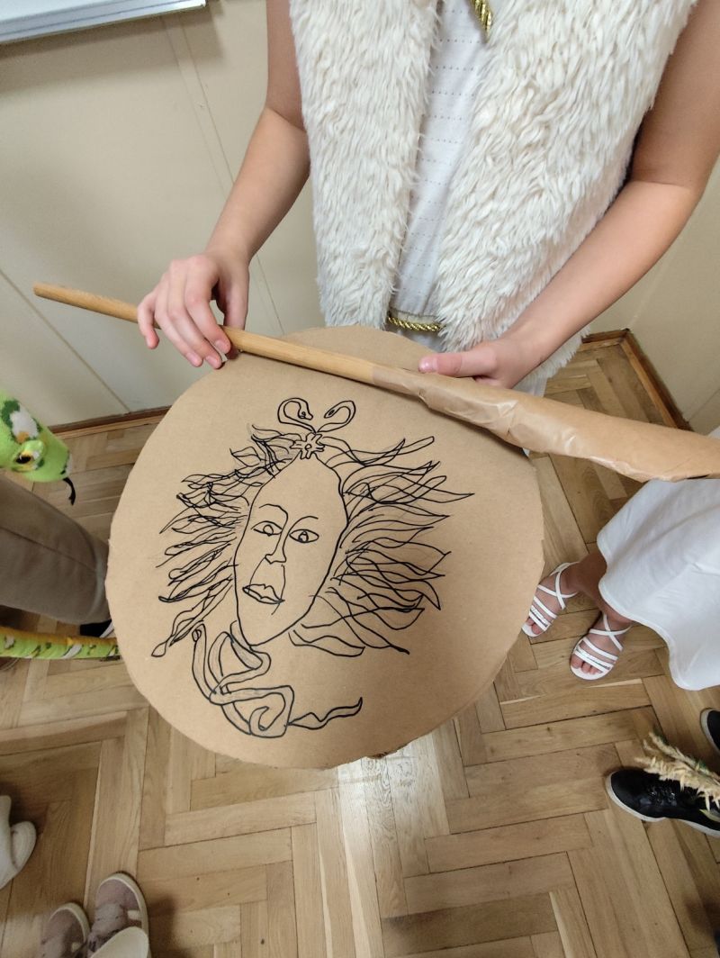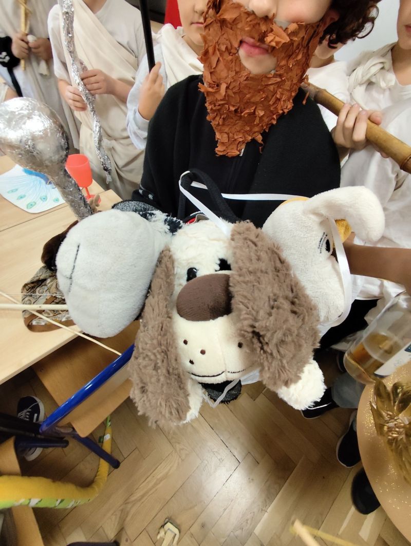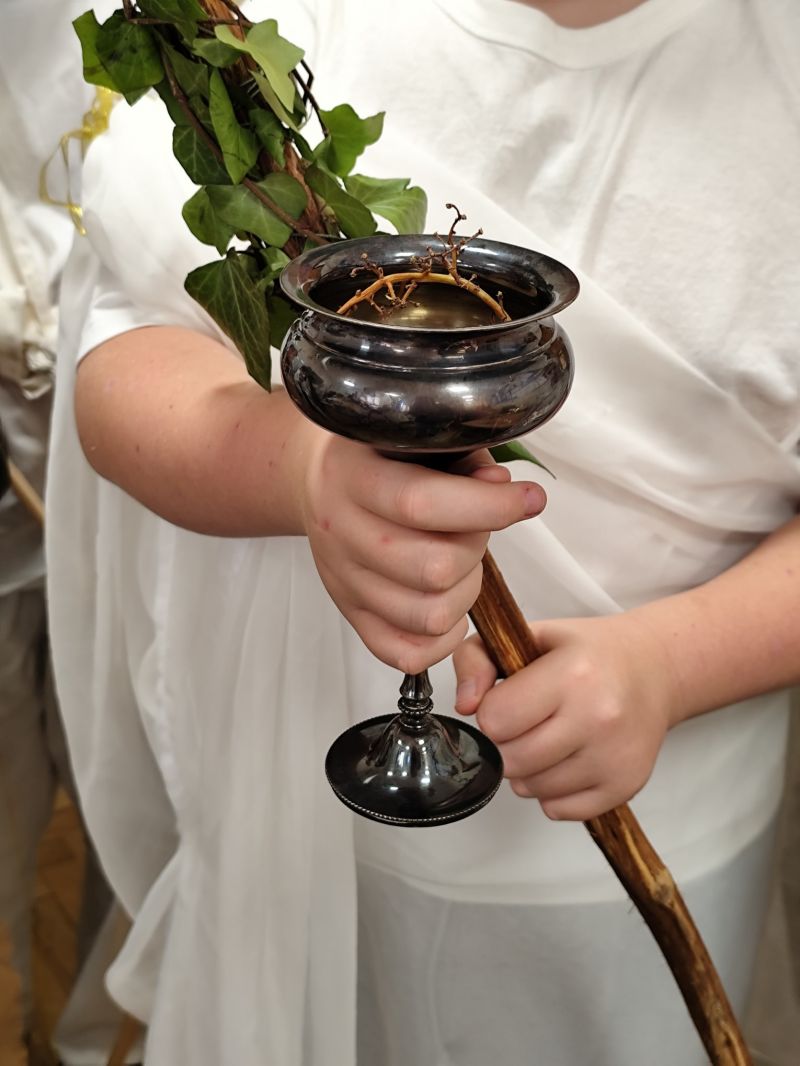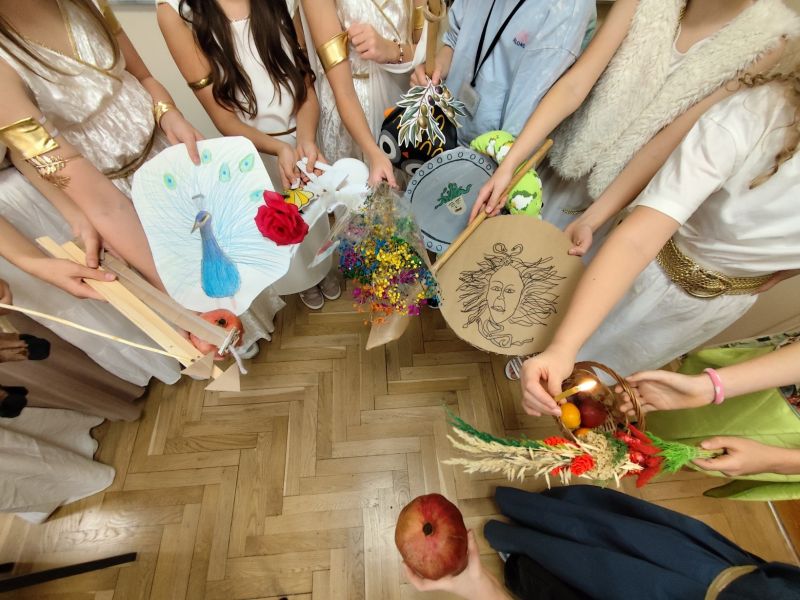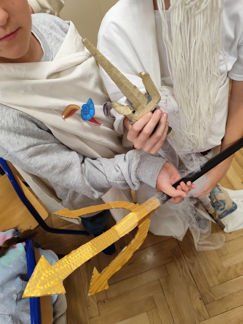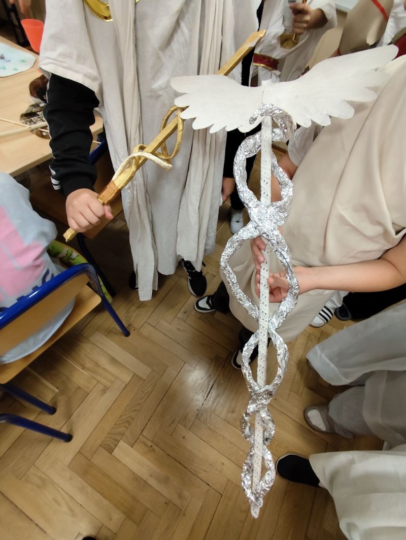 Uczniowie klasy 5a przygotowali prezentację o bogach greckich. Podczas „uczty bogów” opowiedzieli, za którego boga lub boginię się przebrali, i przedstawili ciekawostki o swoich postaciach.