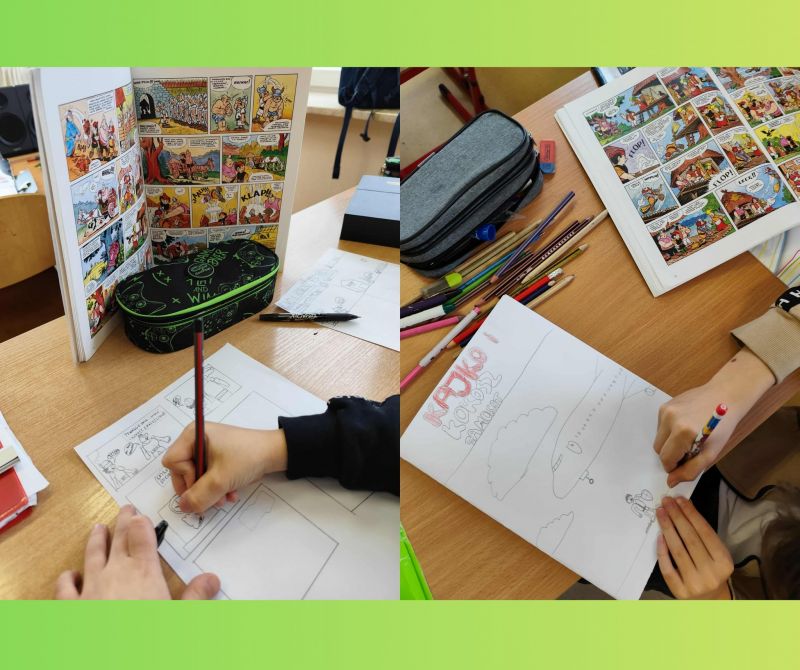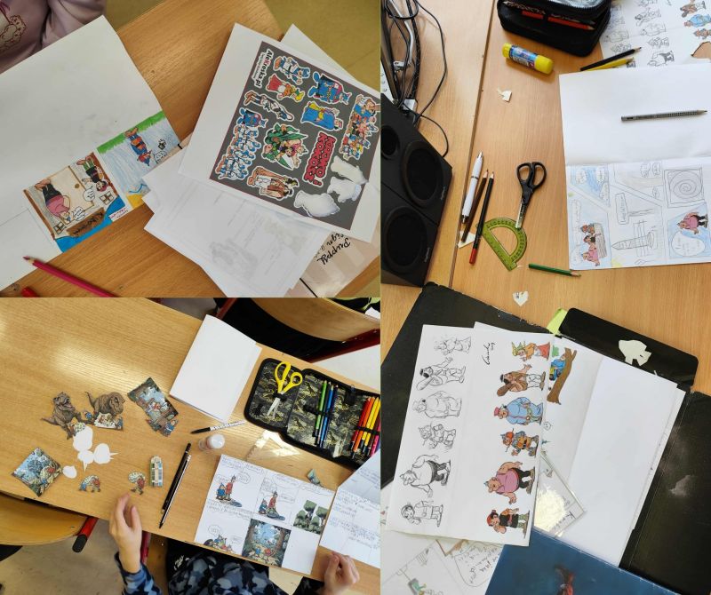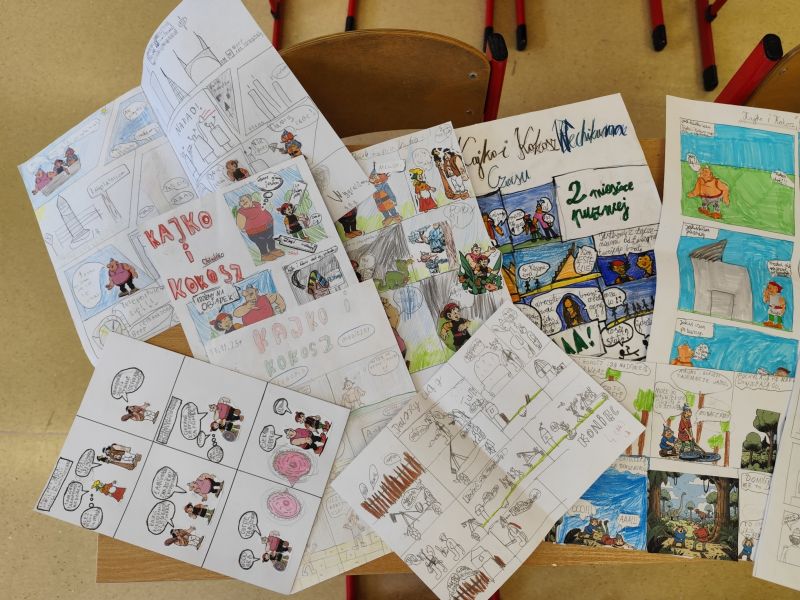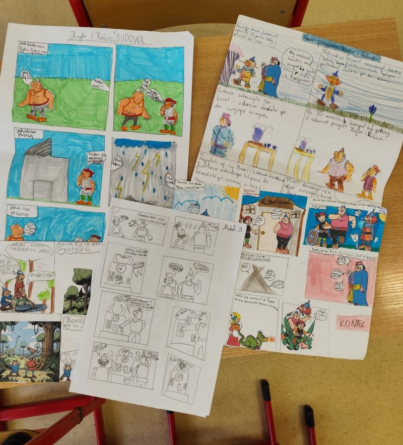 Klasa 4 D na lekcji języka polskiego tworzyła komiks „Nowa przygoda Kajko i Kokosza”, co dostarczyło uczniom dużo radości i rozwijało kreatywność.