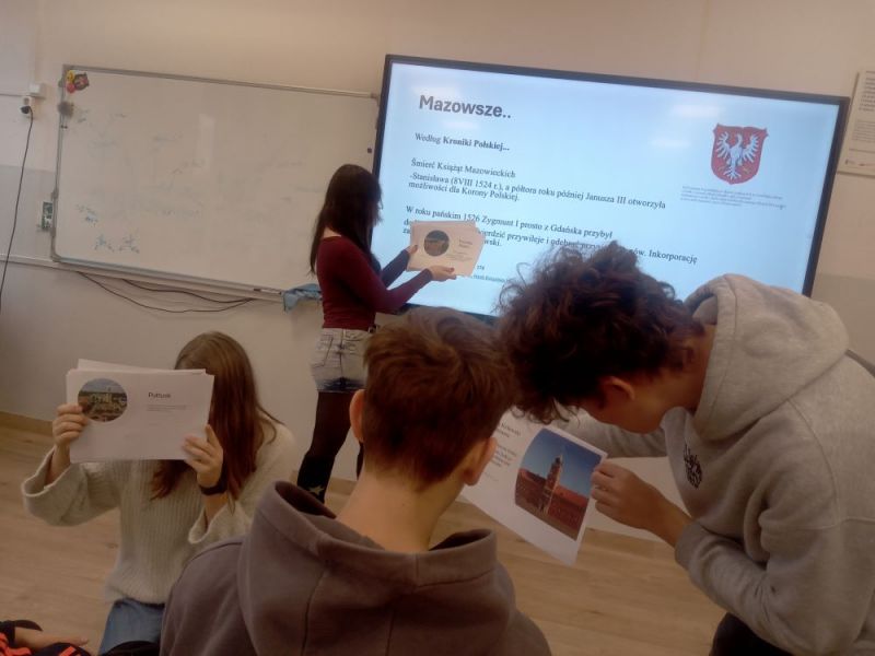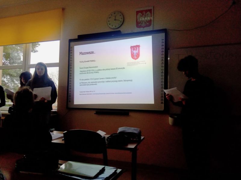 Owoce swojej pracy prezentowali w klasach 7 b, 6 e, 5c oraz 1e . Z pasją opowiadali o przeszłości Mazowsza oraz postaci królowej Bony Sforzy. Zwrócili uwagę na obecny - bogaty dorobek Mazowsza i zachęcili do jego zwiedzania.