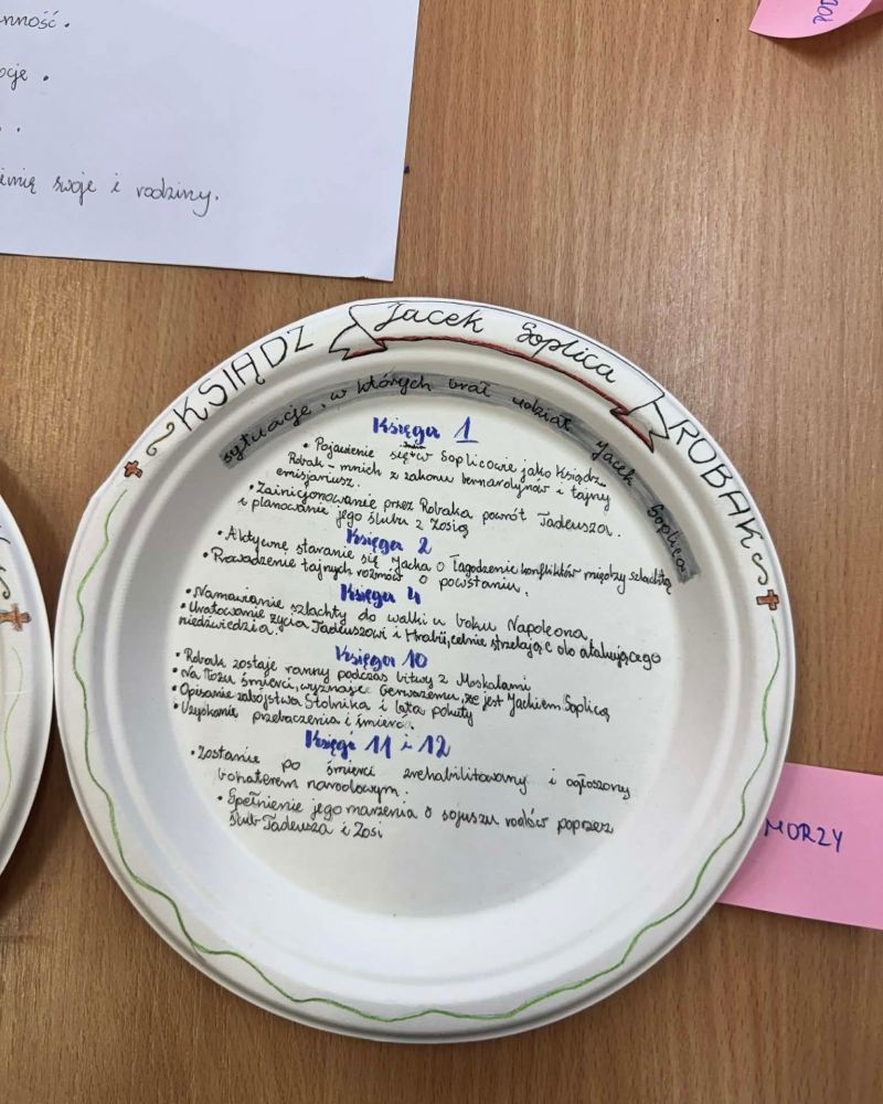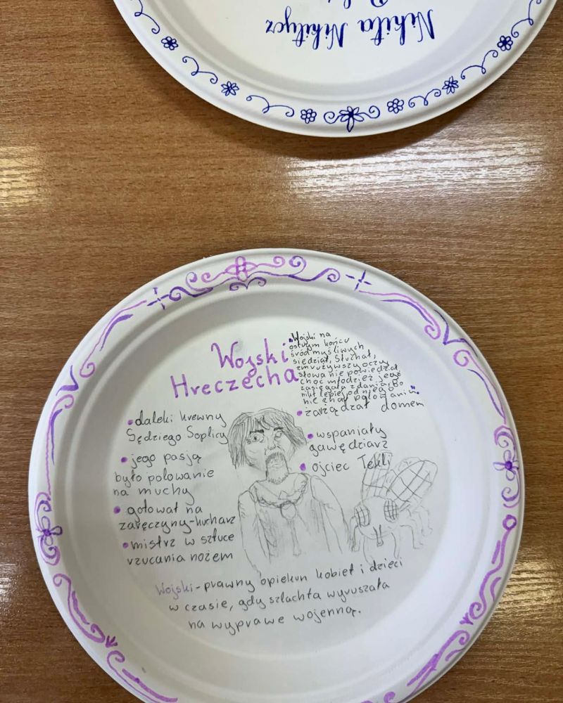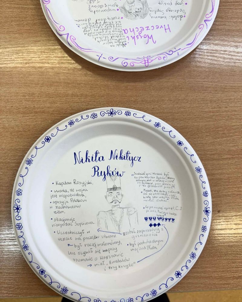 Uczniowie na talerzach przedstawili sylwetki bohaterów biorących udział w uczcie, tworząc piękne, kreatywne prace inspirowane epopeją narodową.