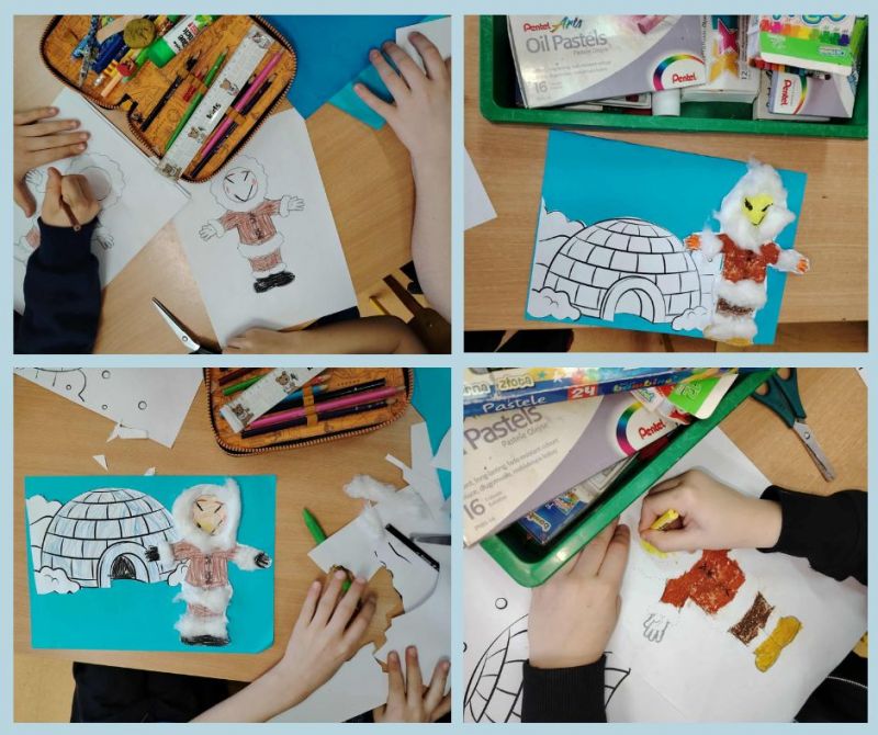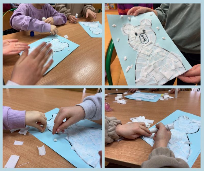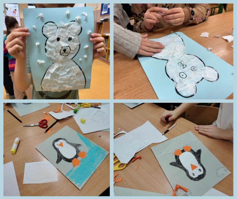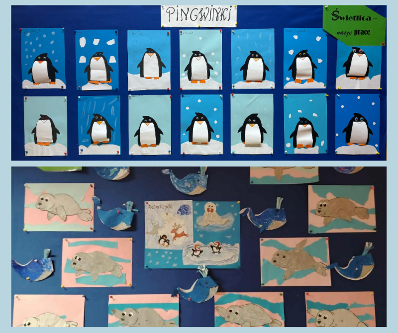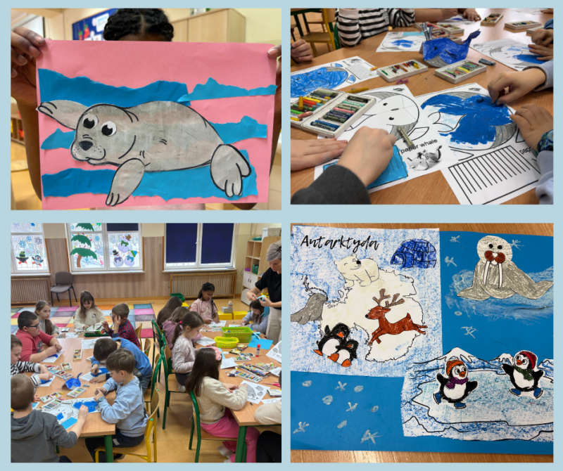 Podczas dzisiejszych zajęć świetlicowych dzieci odkrywały tajemnice Arktyki – mroźnej krainy pełnej lodu, śniegu i niezwykłych zwierząt. Rozmawialiśmy o tym, jak wygląda życie na dalekiej północy oraz jakie zwierzęta potrafią przetrwać w tak trudnych warunkach. W części plastycznej dzieci wykonały kolorowe prace przedstawiające pingwiny i niedźwiedzie polarne, wykorzystując różnorodne materiały i techniki. Dzięki temu mogły połączyć wiedzę o Arktyce z twórczą zabawą. Nie zabrakło również ruchu – podczas zabaw z chustą animacyjną dzieci wcielały się w arktyczne zwierzęta, rozwijając koordynację, współpracę i wyobraźnię. Zajęcia pozwoliły dzieciom lepiej poznać fascynujący świat dalekiej północy.