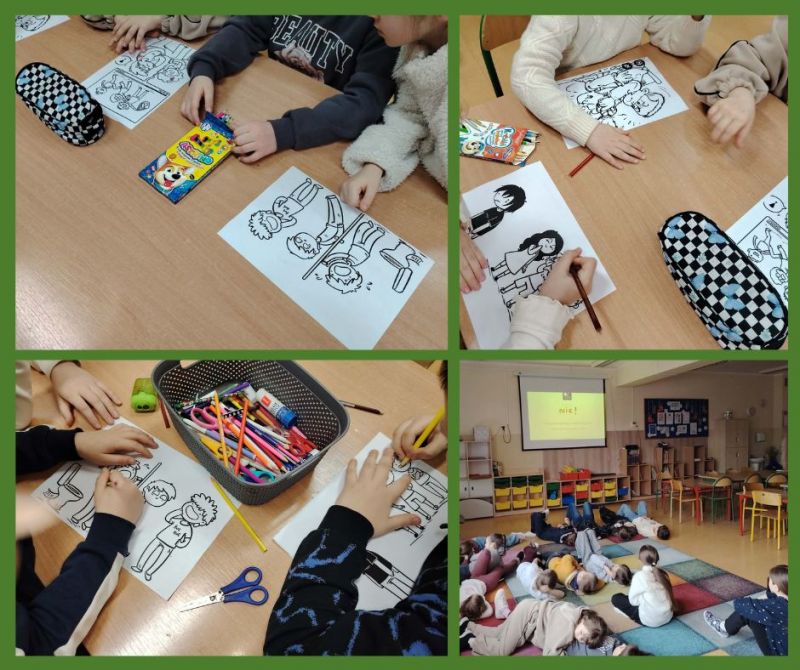 W dalszej części zajęć dzieci uczyły się rozpoznawać i nazywać swoje emocje oraz zastanawiały się, jak można reagować w sytuacjach konfliktowych bez użycia agresji. Omówiono sposoby radzenia sobie z trudnymi sytuacjami, takie jak używanie komunikatów „nie podoba mi się to”, odejście od miejsca konfliktu, rozmowa o swoich uczuciach czy zwrócenie się o pomoc do dorosłego. Podkreślono, że reagowanie na przemoc nie jest skarżeniem, lecz dbaniem o bezpieczeństwo swoje i innych.