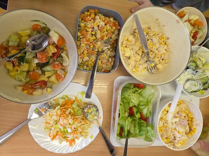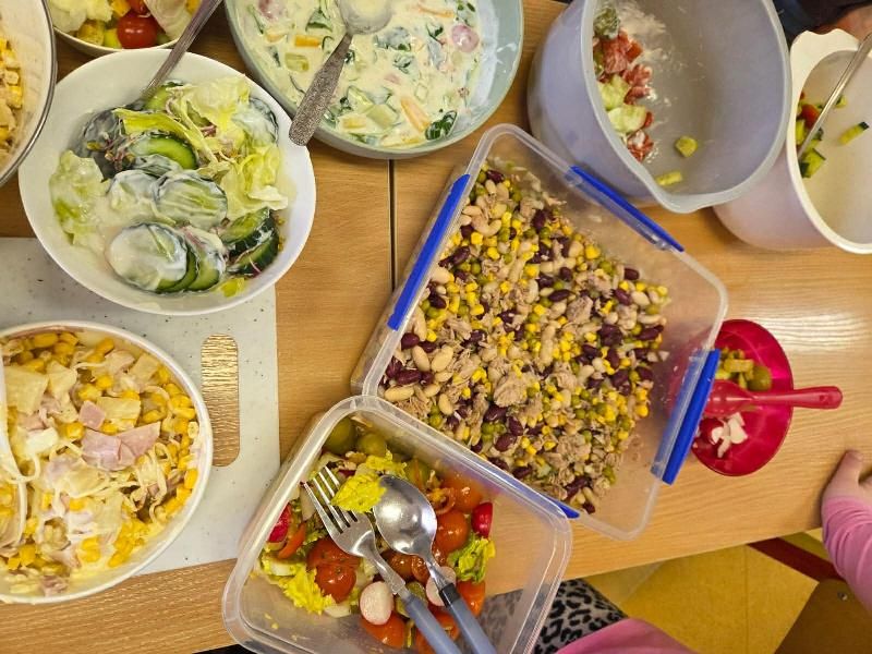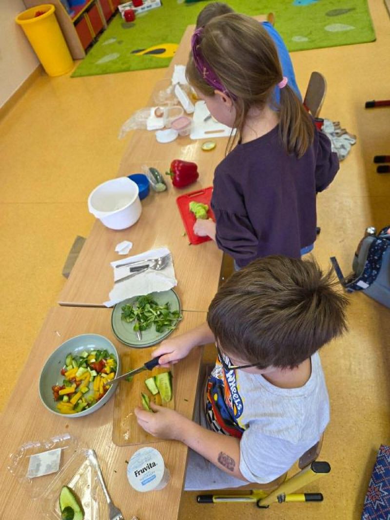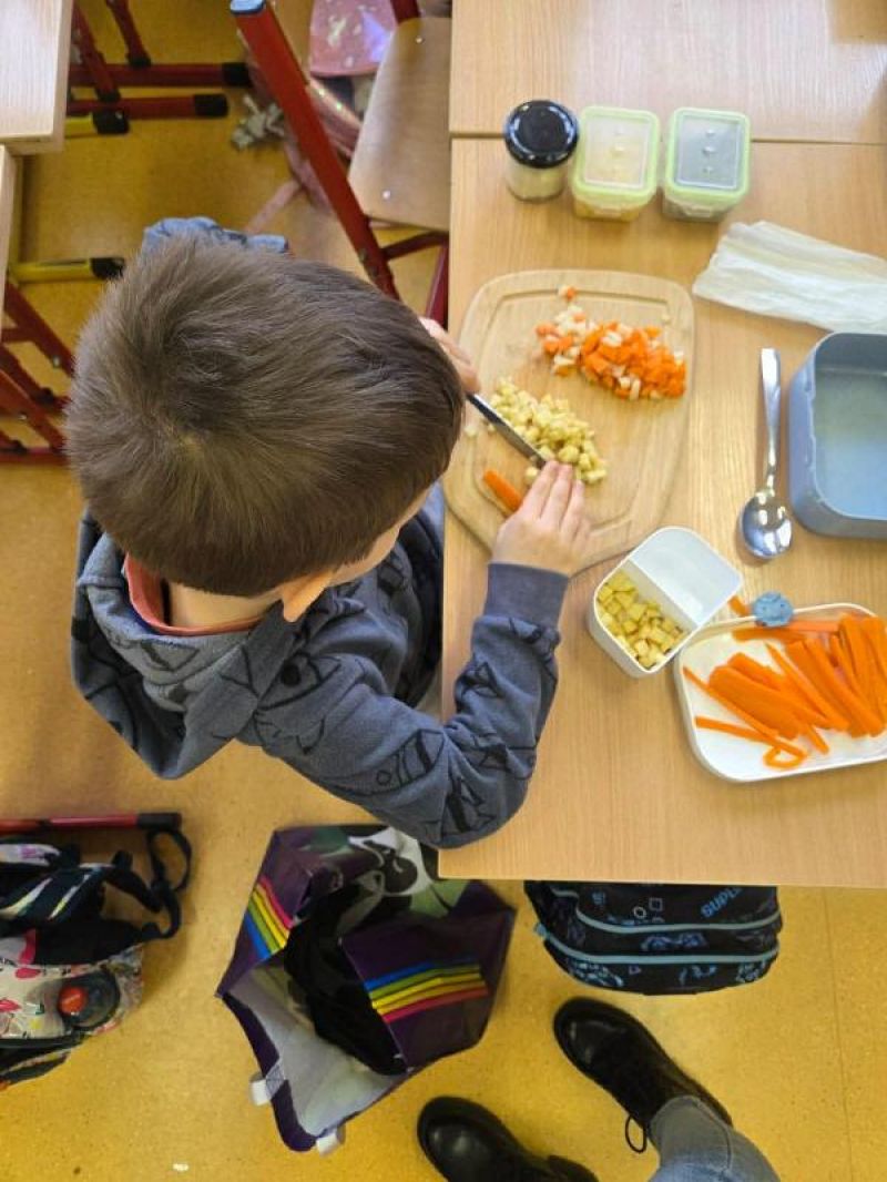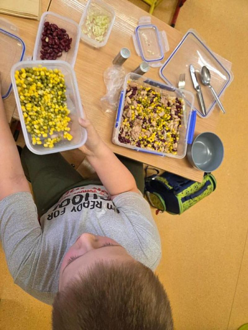 Klasa 1b zamieniła się dziś w zespół młodych kucharzy, przygotowując pełną witamin sałatkę warzywną. Podczas zajęć uczniowie nie tylko trenowali sprawne posługiwanie się nożem , ale też poznali zasady zdrowego odżywiania i higieny pracy w kuchni. Efekt? Kolorowe talerze, mnóstwo radości i duma z samodzielnie przyrządzonego posiłku.