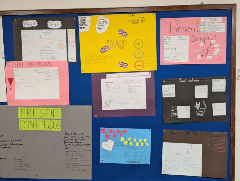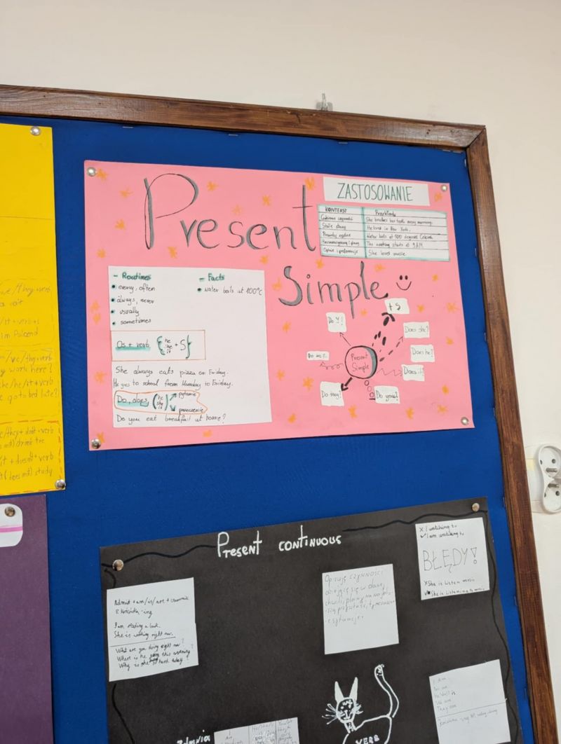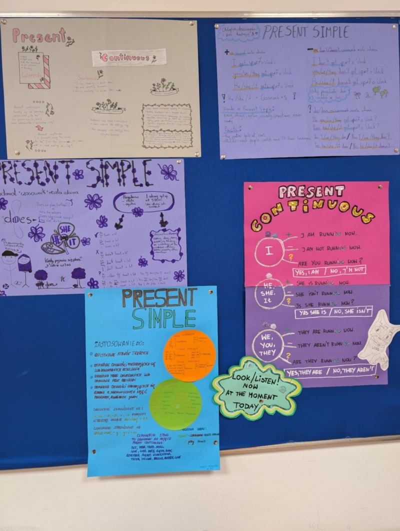 Na innowacjach z języka angielskiego klasy 6c, 7d, 7e oraz 7f utrwaliły sobie główne zasady czasów Present Simple oraz Present Continuous tworząc piękne plakaty