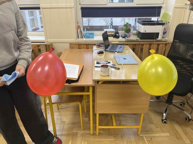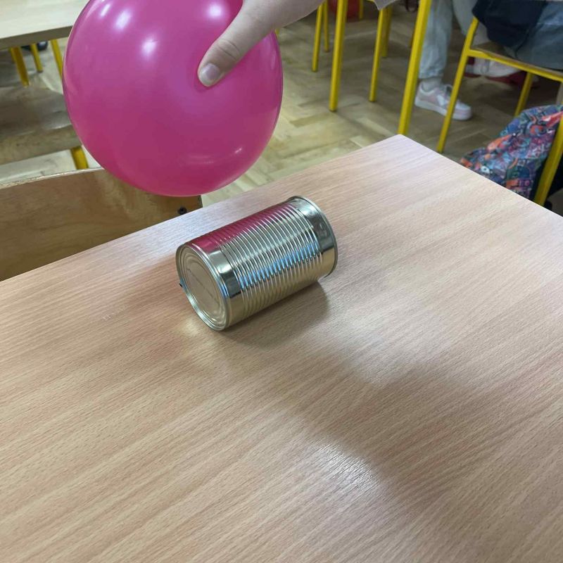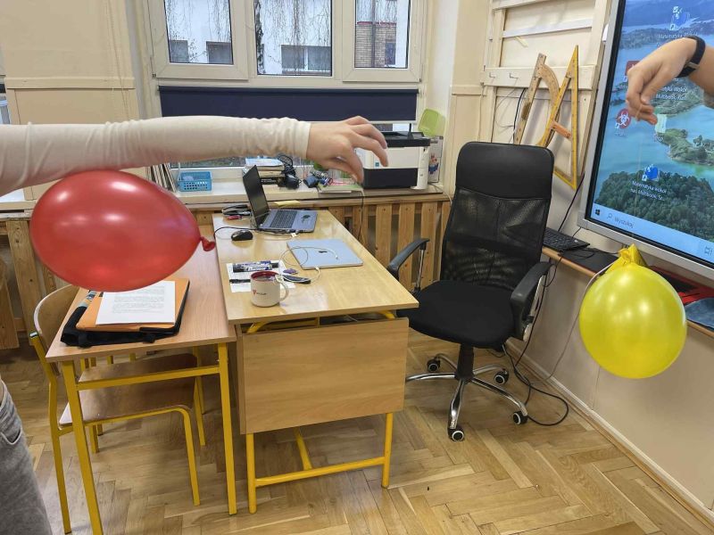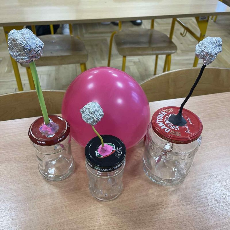 Dziś na lekcji fizyki uczniowie sprawdzali, jak działa elektryzowanie przez tarcie. Balony przyciągały puszki, odpychały inne balony i poruszały „elektroskopy” wykonane własnoręcznie z folii aluminiowej.