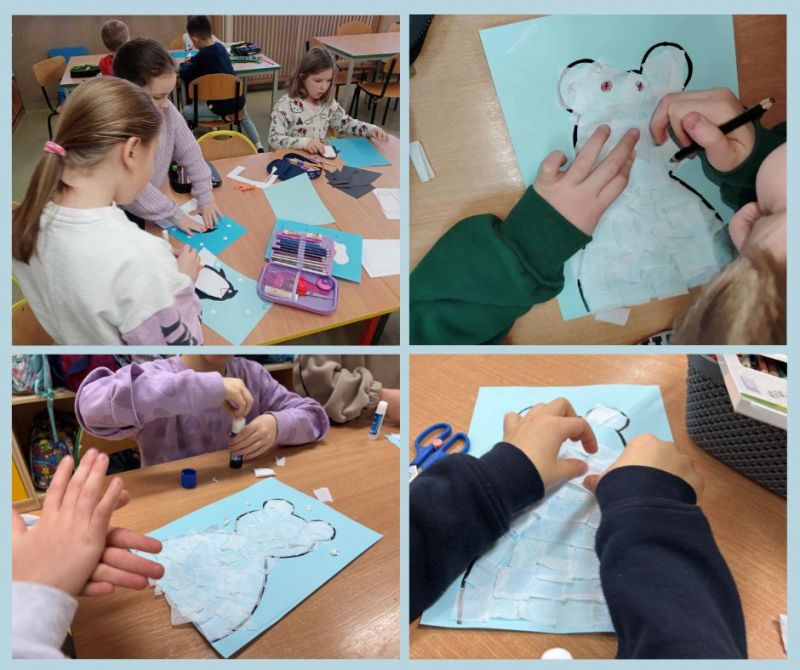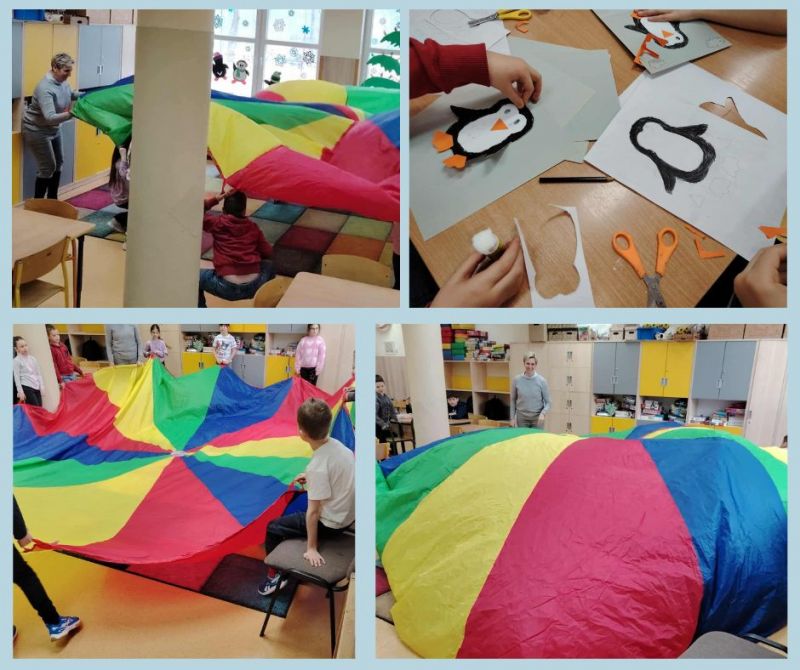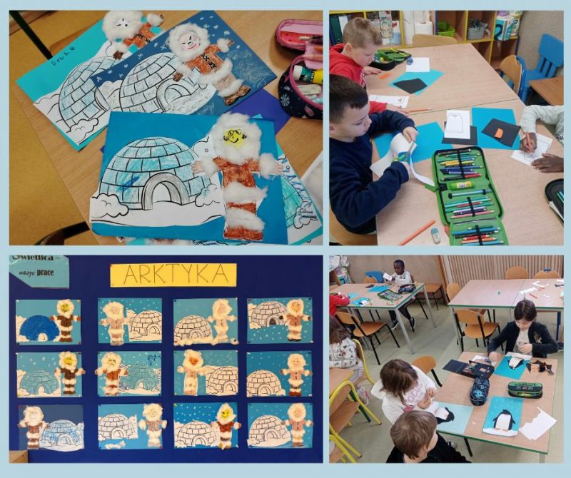 Podczas dzisiejszych zajęć świetlicowych dzieci odkrywały tajemnice Arktyki – mroźnej krainy pełnej lodu, śniegu i niezwykłych zwierząt. Rozmawialiśmy o tym, jak wygląda życie na dalekiej północy oraz jakie zwierzęta potrafią przetrwać w tak trudnych warunkach. W części plastycznej dzieci wykonały kolorowe prace przedstawiające pingwiny i niedźwiedzie polarne, wykorzystując różnorodne materiały i techniki. Dzięki temu mogły połączyć wiedzę o Arktyce z twórczą zabawą. Nie zabrakło również ruchu – podczas zabaw z chustą animacyjną dzieci wcielały się w arktyczne zwierzęta, rozwijając koordynację, współpracę i wyobraźnię. Zajęcia pozwoliły dzieciom lepiej poznać fascynujący świat dalekiej północy.