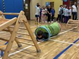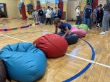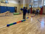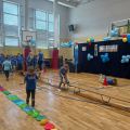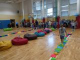 Dla oddziału 0a i klas 1-3 przygotowano w sali gimnastycznej sześć sprawnościowych stacji zadaniowych: „tor z drabinkami, tunelem i zjeżdżalnią”, „sposób na kolorowego węża, czyli utrzymywanie równowagi”, „czworakowanie przez magiczne poduchy”, „podążanie właściwą ścieżką... sensoryczną”, „szybko-mocno-równo, czyli toczenie ciężkiej piłki po ławeczce” oraz „slalom na deskorolce”. Wszystkie konkurencje spotkały się z niezwykłym entuzjazmem ze strony dzieci, które poradziły sobie z nimi po mistrzowsku. Każdy miał szansę poczuć się sportowcem (a przede wszystkim członkiem zgranej drużyny), doświadczyć sukcesu i przyjemnych emocji.