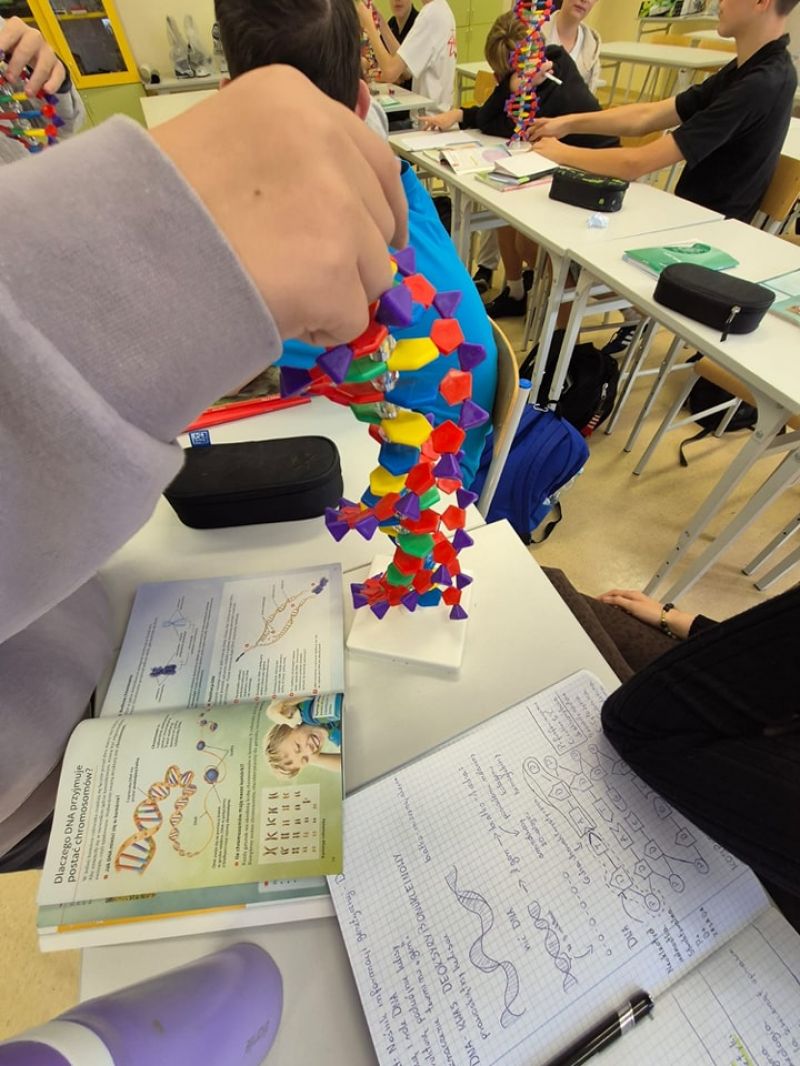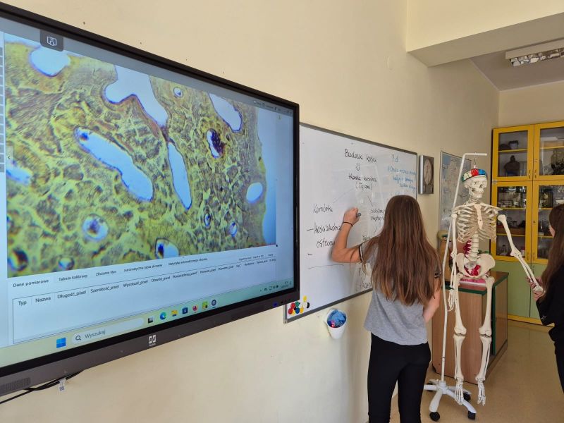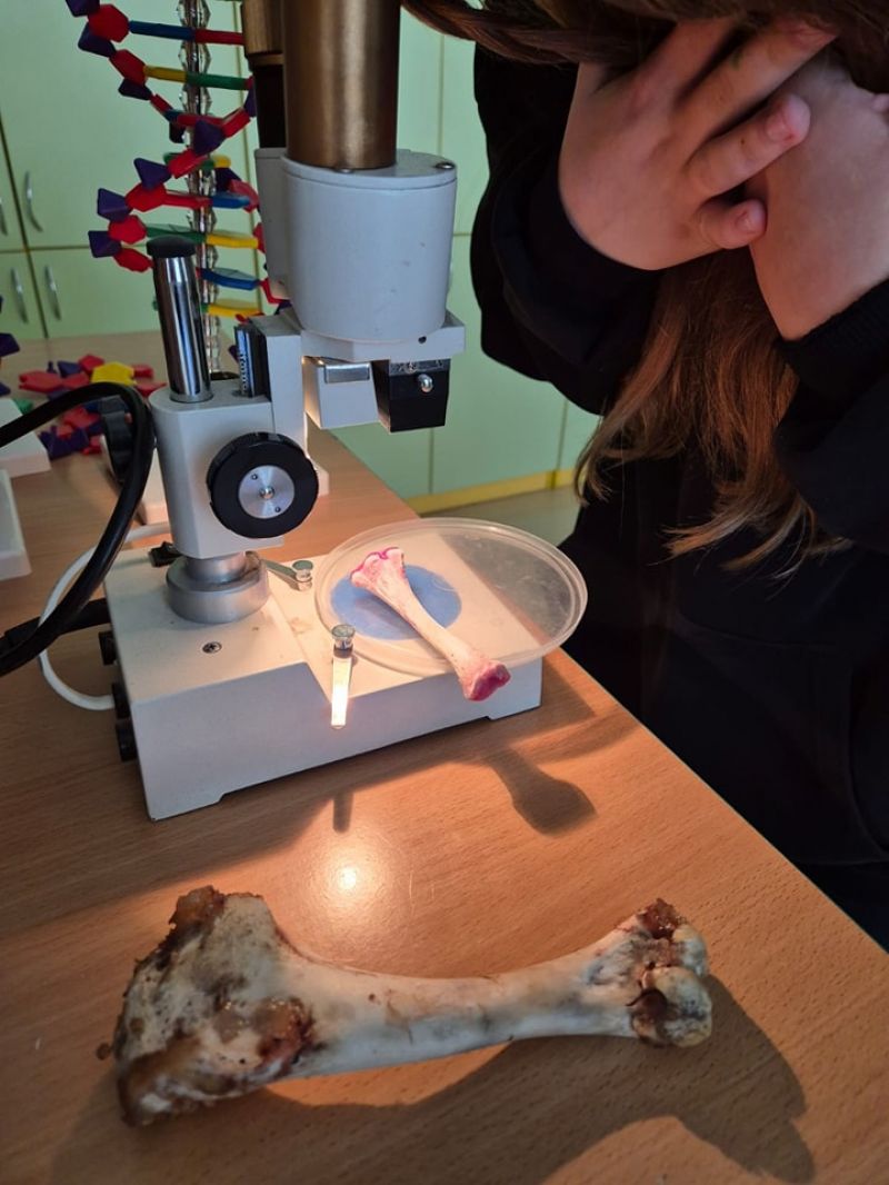 Pomoce dydaktyczne Laboratoria Przyszłości doskonale służą naszym uczniom z klas 7 i 8 w nauczaniu biologii. Dzięki narzędziom możliwa była obserwacja budowy kości w rozmiarze mikro i makro. Uczniowie testowali swoje termoreceptory, receptory bólu i dotyku, reagowali na muzyczne wibracje. Po tym skóra mogła sie zregenerować pod naturalnymi maseczkami wykonanymi na lekcji. Budowa DNA to też prosta układanka, dzięki otrzymanym modelom helisy.