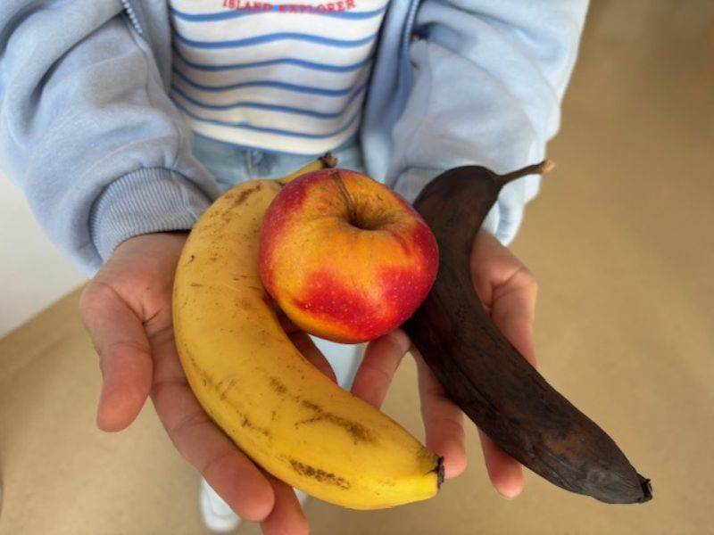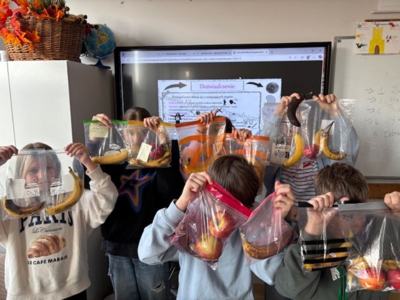 Na biologii w klasach piątych uczniowie badali wpływ naturalnych hormonów jabłka na dojrzewanie bananów.
