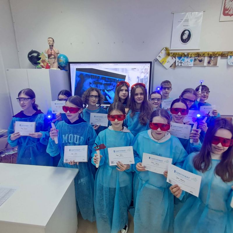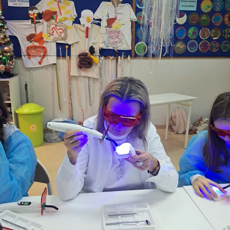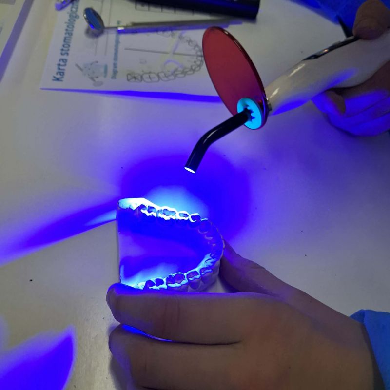 Uczniowie z koła naukowego ,,Nauka skarb Drogi” uczestniczyli w warsztatach stomatologicznych, podczas których poznali etapy powstawania próchnicy, oczyszczali ubytki, borowali i utwardzali plomby.