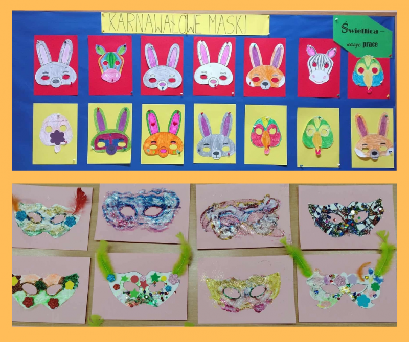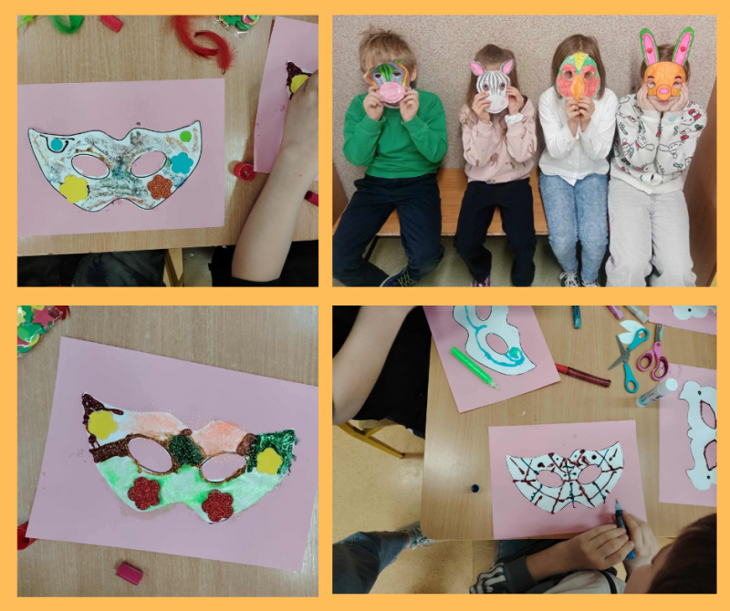 Tematem zajęć w tym tygodniu jest karnawał. Dzieci zapoznały się z tradycją karnawałową oraz charakterystycznymi elementami tego okresu, takimi jak bale i maski. Następnie wykonały pracę plastyczną – maski karnawałowe. Uczestnicy samodzielnie projektowali i ozdabiali swoje maski, wykorzystując kolorowy papier, bibułę, cekiny i inne materiały plastyczne. Zajęcia rozwijały kreatywność, wyobraźnię oraz sprawność manualną dzieci, a także sprawiły im dużo radości.