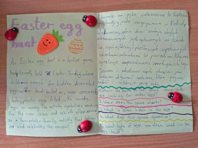 27 marca, uczniowie 5b oraz 5c przygotowali koszyczki wielkanocne - wszystko po angielsku! W koszyczkach znalazły się najpopularniejsze słówka związane z tym świętem oraz opisy naszych ulubionych tradycji wielkanocnych. Serdeczne podziękowania dla uczniów za pomysłowość i zaangażowanie.