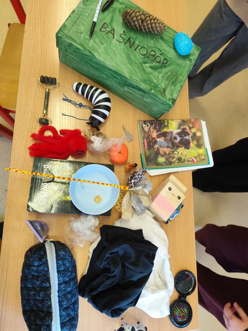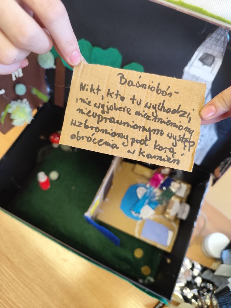 Klasa 6b stworzyła lekturowe pudełka z „Baśnioboru” Brandona Mulla.